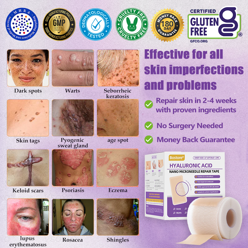 A 𝐵𝑜𝓈𝓉𝑜𝓇𝑒® Hialuronsav Nano Mikrotűs Javító Tapasz, amelyet bőrgyógyász szakértők fejlesztettek ki, a hegeket, striákat, szemölcsöket, bőrcímkéket, keratózist és visszérproblémákat célozza meg – mindössze egy egyszerű megoldással.